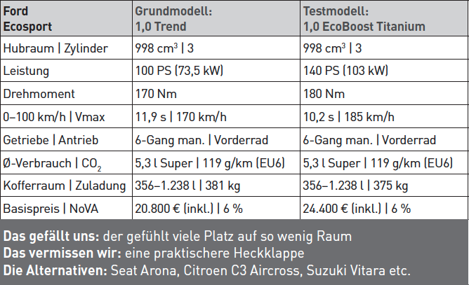 In Südamerika sieht man Fords Ecosport ähnlich häufig wie hier den VW Golf. In Europa konnte sich das Weltauto -er wird mittlerweile für Europa in Rumänien gebaut -bisher noch nicht gänzlich etablieren, was aber vor allem an der teils dürftigen Verarbeitungsqualität der Vorgängergenerationen lag, die in Indien vom Band liefen. Doch damit ist jetzt Schluss, Ford hat in puncto Materialanmut, Spaltmaße und Ergonomie mit dem jüngsten Facelift sämtliche Hausaufgaben gemacht. Und in der Tat, der Innenraum hält nun, was das kleine SUV von außen verspricht. Darüber hinaus ist mit der neuenMittelkonsole und dem großen Touchscreen auch endlich die Knopferlarmada passé, die einen ob der Vielfalt schon mal ziemlich ratlos zurückließ. Weitere Neuerungen: Das fix am Heck montierte Reserverad ist Geschichte (wem"s gefällt, gibt"s noch optional!) und zwecks besserer Vermarktbarkeit in den Alpenländern ist der Ecosport auch erstmals mit Allradantrieb erhältlich. Den gibt"s allerdings nur in Verbindung mit dem 125 PS starken Diesel. Und weil gerade in dem SUV-A-Segment immer mehr zum Benziner greifen, haben wir uns für den Test den stärksten Otto-Motor mit 140 PS, Sechsgang-Handschaltung, Frontantrieb und in der Top-Ausstattung "Titanium" entschieden.