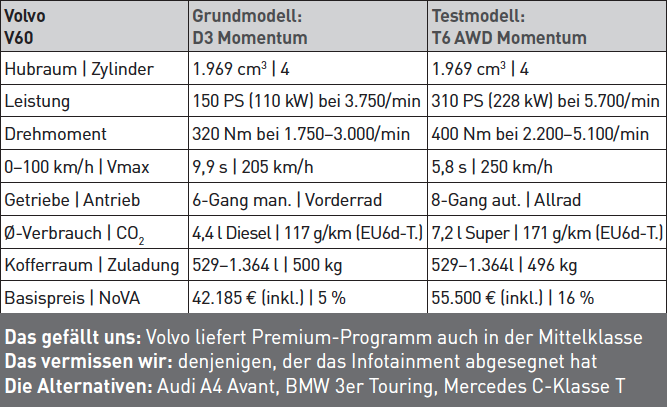 Es ist tatsächlich ein starkes Design geworden. Wo der V90 bereits schön war, ist der V60 nun hinreißend. Da die Heckscheibe aufrechter steht, ist der Praxisnutzen jedoch groß: Bei voller Passagieranzahl passen im größeren Modell gerade einmal 30 Liter mehr Gepäck in den Kofferraum; 162 Liter sind es, wenn die Sitze umgeklappt werden. Stichwort Dynamik: Da geht was voran, wenn man mit dem Fahrprofilschalter Sport auswählt. Schub ist da, trotzdem richtet sich Volvo nicht an die Kurvenhetzer. Dafür ist teilautonomes Fahren bis 130 km/h möglich, wenn man das sinnvolle Intellisafe-Pro-Paket in derListe der Optionen auswählt. Das Licht-Paket mit den Voll-LED-Scheinwerfern sollte ebenso an Bord sein. Wenn wir jetzt noch das Business-Paket Pro erwähnen, das Navi, Smartphone-Integration und mehr bietet, wird klar: Selbst die Momentum- und Inscription-Modelle kann man in höhere Preisdimensionen bringen. Mit dem neun Zoll großen Infotainment-Touchscreen konnten wir uns übrigens nicht so recht anfreunden.