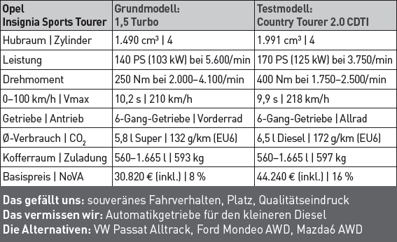 Zum Oberklasse-Feeling tragen neben Fahrwerk und Ausstattung die verlässlichen Assistenzsysteme bei. Sanftes Dahingleiten und entspannte Autobahnfahrten lässt der Insignia Country Tourer ebenso gerne zu wie sportliche Kurvenfahrten. Trotz perfektem Schaltgetriebe, eine Automatik wäre fein, die gibt"s allerdings nur für den stärkeren 210-PS-Diesel. Die Preislistestartet bei 44.240 Euro, umfangreiche Serienausstattung inklusive.