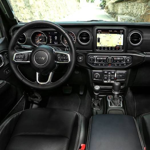 Gleich drei neue Dachkombinationen hat Jeep im Angebot: ein Stoffdach, das auf Knopfdruck fast über die ganze Länge zu öffnen ist, ein Hardtop mit drei abnehmbaren Teilen und das sogenannte Sunrider-Rooftop, das in vielen Bereichen verbessert wurde. Das Thema Sicherheit bekommt nun einen größeren Stellenwert. Totwinkel-Warner und hintere Querverkehrserkennung gehören ebenso zu den Neuigkeiten wie die Rückfahrkamera mit dynamischem Führungsraster. Volle Handyanbindung gibt es bereits mit dem 7-Zoll-Infotainmentsystem, die 8,4-Zoll-Variante holt mit einer Reihe an Apps noch mehr für den Fahrer heraus.