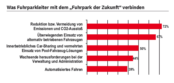 Fragt man die Fuhrparkmanager, was sie mit dem Begriff „Der Fuhrpark der Zukunft“ verbinden und mit welchen Änderungen sie rechnen, steht der ökologische Aspekt ganz oben. Für 72 Prozent hat die Reduktion beziehungsweise Vermeidung von Emissionen und CO2-Ausstoß höchste Priorität, dicht gefolgt vom überwiegenden Einsatz alternativ betriebener Fahrzeuge. Jeder zweite geht zudem davon aus, dass das innerbetriebliche Carsharing und der Einsatz von Pool-Fahrzeugen an Bedeutung gewinnen werden. Dass die Komplexität steigt, nehmen zumindest 44 Prozent an, sie rechnen mit wachsenden Herausforderungen bei der Verwaltung und der Administration der Fahrzeuge. Bereits 39 Prozent haben das automatisierte Fahren auf der Rechnung.