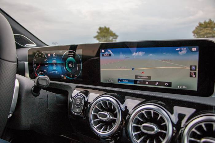 Womit wir beim Innenraum des kleinen Schwaben wären. Wer sich in der Preisliste austobt, der bekommt ordentlich was geboten. Sofort ins Auge sticht der aus größeren Mercedes-Modellen bekannte, riesige Screen, der sich vom Navi bis zu den Armaturen zieht, wodurch unterschiedliche Ansichten zur Wahl stehen. Das neue MBUX-System (Mercedes Benz User Experience) beinhaltet ein anfangs gewöhnungsbedürftiges Touchpad zur Steuerung der Einstellungen sowie die Sprachassistentin. Die wird mit dem Zuruf „Hey Mercedes“ aktiviert und lässt sich – ähnlich wie Siri am iPhone oder Amazons Alexa – mittels Sprachdialogen bedienen. Die Preisliste der A-Klasse startet bei 28.750 Euro für den A 160, der A 200 ist ab 33.290 Euro zu haben, mit einiger Luft nach oben für Extras.