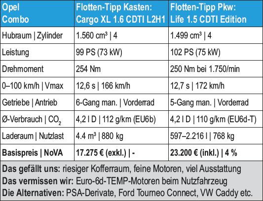 Während die Ausstattungsfeatures für Pkw- und Nutzfahrzeugvarianten gleichermaßen zu haben sind, müssen die Cargo-Varianten, die im November in den Handel kommen, anfangs motorisch noch leichte Abstriche machen, sind doch der 75-und der 99-PS-Turbodiesel noch nicht mit dem Euro 6d-TEMP-Siegel versehen. Die Umstellung erfolgt in Österreich mit dem 2. Quartal 2019. An den Ladekapazitäten ändert das freilich nichts, bis zu einer Tonne Nutzlast, 4,4 Kubikmeter Laderaum und zwei Euro-Paletten (auch mit kurzem Radstand) schluckt der Combo Cargo. Top: Mit dem Start des Motors erfolgt eine Gewichtskontrolle, der Fahrer hat somit die Zuladung perfekt im Visier. Die Preisliste beginnt beim Pkw bei 21.000 brutto, beim Kastenwagen bei 14.900 Euro netto.