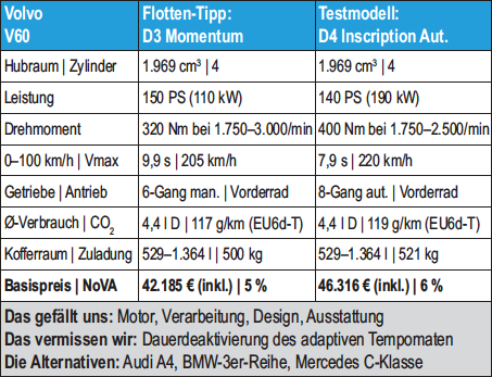 Unterm Strich kann der neue Volvo V60 sowohl von der Verarbeitung als auch der Motorisierung mit der deutschen Premium-Liga mithalten. Das gilt freilich auch für den Preis, mindestens 46.316 Euro sind fällig, unser Testauto inklusive aller Extras kam auf 58.500 Euro. Wie sich der V60 kosten- und restwertseitig im Vergleich mit Audi, BMW und Mercedes schlägt, sehen Sie im ausführlichen FLOTTEN-Check - als pdf zum Download.
