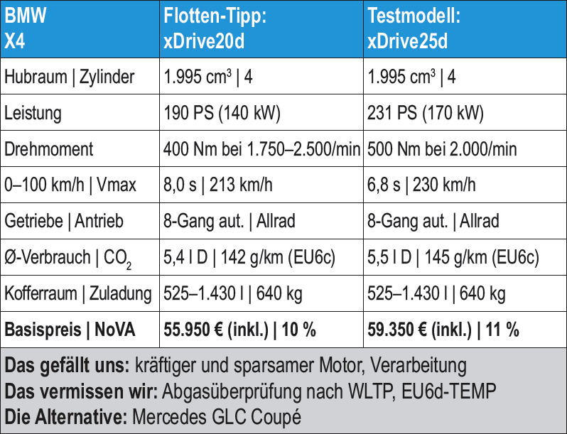 Zugegeben, vieles davon ist natürlich „nice to have“, aber nicht zwingend nötig, um mit dem X4 glücklich zu werden. Nicht fehlen sollte das Österreich-Paket, das für rund 1.000 Euro nicht nur automatisch abblendende Spiegel, Lordosenstützen vorn oder den Park-Assistenten, sondern vor allem auch das Business-Navi mitbringt. Das Head-up-Display ist für Vielfahrer ebenso angenehm wie der adaptive Tempomat, der in Kombination mit dem Spurhalteassistenten auch kurzes teilautonomes Fahren ermöglicht. Fein: Mit nur einem Tastendruck lässt sich die Adaptiv-Funktion abschalten und der Tempomat auf herkömmliche Art und Weise nutzen, was bei bestimmten Verkehrssituationen angenehmer sein kann. Besonders hervorzuheben sind bei BMW die gelungene Sprachsteuerung. Das Ansagen von Adressen für’s Navi klappt hervorragend und ohne zigfaches Nachfragen wird die Zielführung sofort gestartet. Auch die Anbindung der App, über die sich der Standort und andere Parameter wie der Tankinhalt auslesen lassen, ist vorbildlich gelöst.