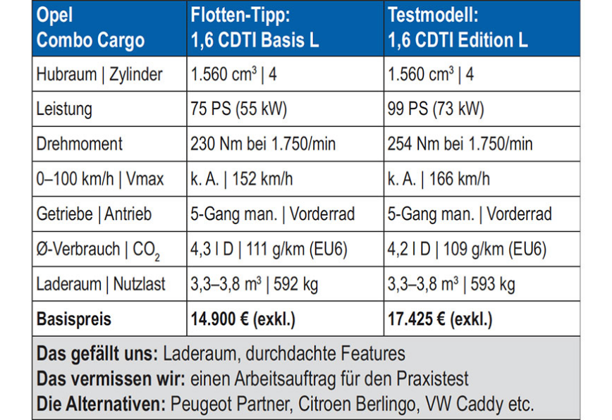 Auch für das „Privatgepäck“ finden sich in der Fahrerkabine, die maximal drei Personen beherbergt, allerhand Ablageflächen, sogar eine im Instrumententräger vor dem Lenkrad. In den Überkopfstauräumen lassen sich Jacken etc. leicht unterbringen, wenn man nicht die Haken an der Trennwand hinter den Sitzen verwenden möchte. Nur auf der Suche nach Flaschenhaltern wird man verblüffenderweise nicht fündig. In puncto Fahrkomfort sind wir schnell wieder beim Thema „Pkw-Niveau“, die Abstimmung ist dabei bereits von GM-straff auf PSA-soft umgeschwenkt. Das Abrollverhalten des Fahrwerks ist tadellos, dazu passt, dass der 1,6 CDTI-Diesel mit 99 PS geschmeidig und elastisch zu Werke geht, dabei aber auch dem beladenen Vehikel gut gewachsen ist. Dass die Geräuschdämmung nicht ganz auf Pkw-Niveau liegt, wird den Professionisten kaum stören. Motor und Schaltung (in unserem Fall der 5-Gang-Handrührer) harmonieren gut, gerade im städtischen Lieferverkehr sorgt denn auch die im Segment noch nicht alltägliche Start-Stopp-Automatik für ein gutes Öko-Gewissen. Den angegebenen Verbrauch von 4,2 Litern wird man trotzdem nur schwer erreichen, aber je nach Beladungszustand dürften fünf bis sechs Liter wohl realisierbar sein.