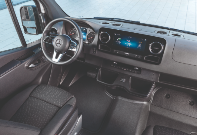 Nur allzu oft haben Fachmedien darüber berichtet, dass Pkw-Feeling in die neuen Nutzfahrzeuge eingezogen ist. Wie echtes Pkw-Feeling in einem 3,5-Tonner auszusehen hat, zeigt Mercedes mit dem neuen Sprinter. Seine Hemdsärmeligkeit hat der Transporter nicht verloren, ausstaffiert mit den entsprechenden Extras setzt sich der Mercedes-Transporter aber an die Spitze des Segments. Und das beginnt bereits beim Fahrersitz. Dank ausziehbarer Schenkelauflage ist der Komfort hoch wie nie, das Lenkrad kommt so auch in der A-Klasse und anderen Mercedes-Pkw-Modellen zum Einsatz. Auf Zuruf "Hey Mercedes" wird die Sprachsteuerung aktiviert, mit der sich etwa ein Ziel ins Navi sprechen lässt.