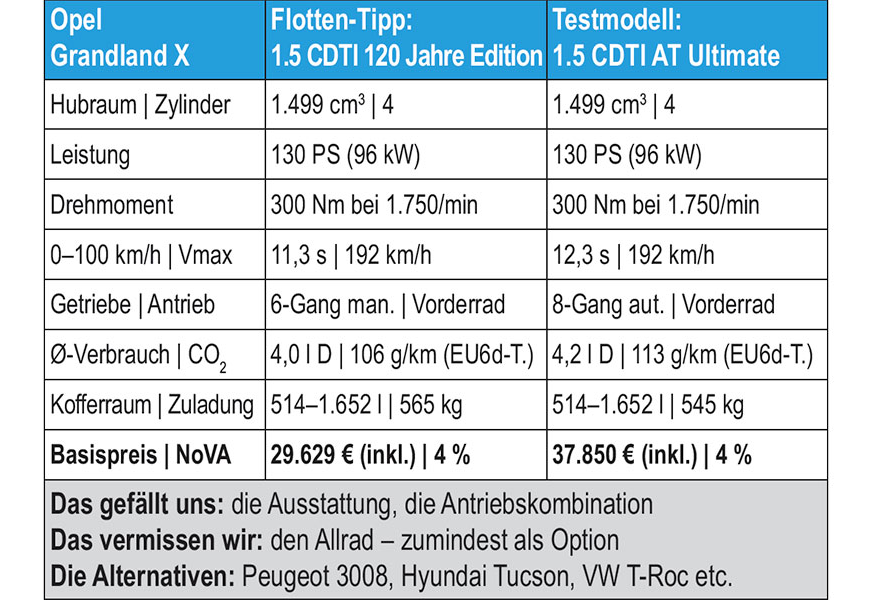 Wir sind noch keinen Meter gefahren, aber dennoch stört uns schon ein Umstand am Grandland X: Es gibt ihn nur mit Frontantrieb. Allrad ist weder für Geld noch großes Betteln zu haben. Der Grund: Der Opel ist eigentlich ein Peugeot 3008. Und den gibt's eben auch nicht mit 4x4- Antrieb. Zur Ehrenrettung: Klar, der österreichische Pkw-Markt ist nicht der Nabel der Welt, unsere Bedürfnisse in Sachen Ganzjahresmobilität werden im PSA-Konzern deshalb auch nicht gehört. Und auch immer mehr andere Hersteller beziehungsweise Firmenwagenlenker verzichten aus Kostenund CO2-Gründen auf den traktionsreichen Antrieb. Aber sei es, wie es sei: Allrad stünde dem 4,48 Meter langen und 1,45 Tonnen schweren Grandland X prinzipiell dennoch sehr gut - allein weil wir als Vielfahrer nicht auf das zusätzliche Quäntchen Sicherheit verzichten möchten - und sei es nur auf regennasser Fahrbahn im Sommer. Wir gaben dem Opel mit französischer Seele dennoch eine Chance, zu überzeugen. Und siehe da, das SUV funktioniert auch mit Frontantrieb im Alltag ganz wunderbar. Vor allem die Langstrecke und Überland liegen ihm. Dank guter Dämmung, bequemem AGR-Gestühl (das sind die mit dem "Gesunder-Rücken"-Prüfzeichen) und einem großzügigen Platzangebotfür Passagiere und Gepäck reist es sich ziemlich sorgenfrei im Grandland X.