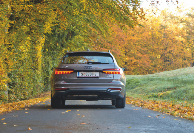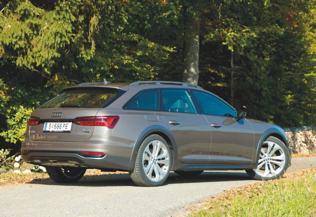 Eins der Kabinettstückerln des auf Gelände gepimpten Audi ist die serienmäßige Luftfederung. Mit ihr kann man den Wagen um maximal 45 Millimeter anheben, wenn das Terrain rauer wird und man unter 35 km/h bleibt. Bei einer Geschwindigkeit von über 120 km/h auf der Autobahn senkt sich der Kombi dafür automatisch um 15 Millimeter ab. Und auf der langen schnellen Strecke ist der A6 mindestens ebenso in seinem Element wie auf dem ungeteerten Weg zum Ansitz. Motorisch kommt der Diesel hier in seiner sinnvollsten Form zum Einsatz. Der bärige V6 mit 286 PS eignet sich perfekt als Antrieb für einen Kilometerfresser, der schon im Antritt richtig Leistung liefert und auch als Zugfahrzeug bis zu 2.500 Kilogramm seinen Mann steht. Dass Luxusleistung wie diese sowohl bei der Anschaffung als auch im Betrieb Geld kostet, bedarf keiner Erwähnung. Dass der Preis für das mit erlesenen Extras verbrämte Testexemplar letztlich bei 109.358,44 Euro zu liegen kommt, verblüfft dann doch ein wenig. Der Verbrauch pendelte sich mit Mildhybridisierung bei gut sieben Litern ein, was auch bei so viel Nutzwert in Ordnung, aber nicht rekordverdächtig ist.