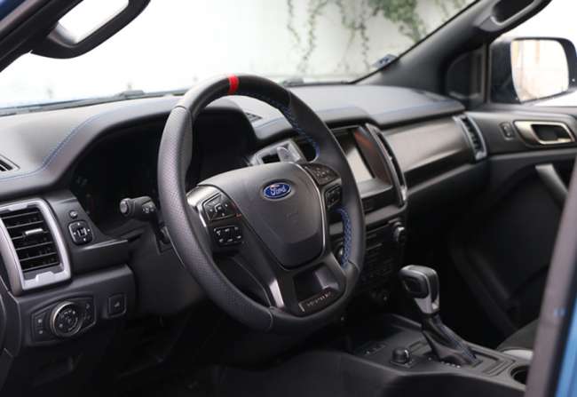 Es ist ein Auftritt wie einer von Chucks Arschtritten: Der Ranger Raptor ist mit 5,40 Meter Länge, deutlich über zwei Meter Breite und 2,5 Tonnen Gewicht ausgesprochen eindrucksvoll. Da Pick-ups in Amerika traditionell als landwirtschaftliche Nutzfahrzeuge gehalten werden, sei der Hinweis gestattet, dass ein Einsatz am Bio-Bauernhof die einzige Chance ist, dass der Laster je ein Öko-Siegel bekommt.