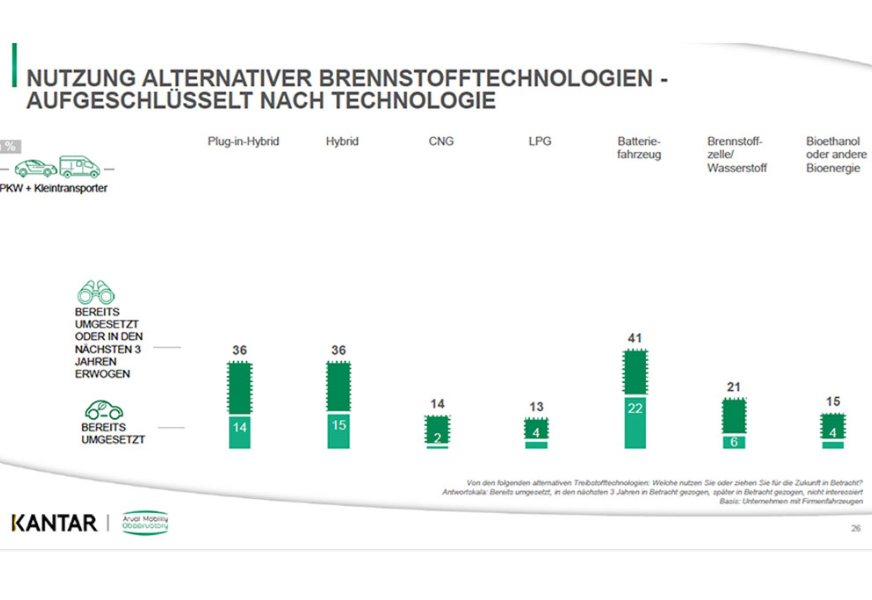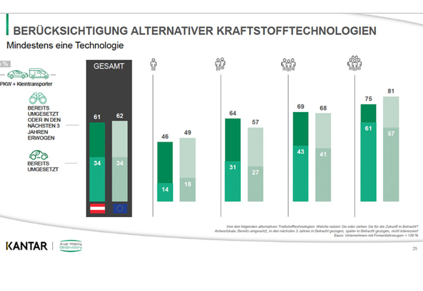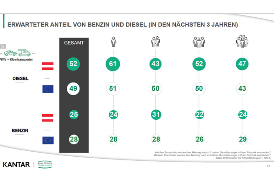 In Zukunft gehe der Trend in Richtung Leasing. Jedes zweite Unternehmen sei daran interessiert, auf Finanzierungsleasing für seine Flotte zu setzen. Auch Operating-Leasing sei für 41 Prozent der österreichischen Unternehmen attraktiv. Der Dieselanteil werde in drei Jahren deutlich sinken, so Beckstein-Bichler: „Östereichs Flotten haben traditionell einen hohen Anteil an Dieselfahrzeugen. Derzeit liegt er bei über 80 Prozent. Viele Unternehmen wollen in den nächsten drei Jahren den Dieselanteil auf 52 Prozent senken. 22 Prozent der Unternehmen haben bereits E-Autos im Einsatz, in den nächsten drei Jahren sollen es über 40 Prozent werden.“