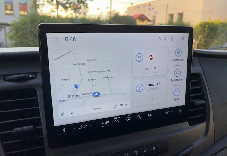 Rein optisch unterscheidet sich der Elektriker nicht groß von seinen Diesel-Brüdern, der in Blau gehaltene Kühlergrill ist der einzig sichtbare Unterschied. Unter dem Ford-Emblem verbirgt sich übrigens auch der Ladeanschluss, das ist definitiv praktischer als bei Fahrzeugen, die diesen seitlich haben und aufgrund der Kabellänge beim Parken an die Gegebenheiten angepasst werden müssen. Bleiben wir gleich beim Laden. Die Batterie verfügt über eine Kapazität von 77 kWh, 68 davon sind für den Fahrbetrieb nutzbar. An einer AC-Wechselstrom-Wallbox mit elf kW ist der E-Transit in acht Stunden geladen, am DC-Schnelllader mit 115 kW dauert der Vorgang von 15 auf 80 Prozent nur 30 Minuten. Die WLTP-Reichweite hängt von der jeweiligen Ausführung ab und bewegt sich zwischen 258 und 317 Kilometern und übertrifft damit die Konkurrenz mehr oder weniger deutlich.