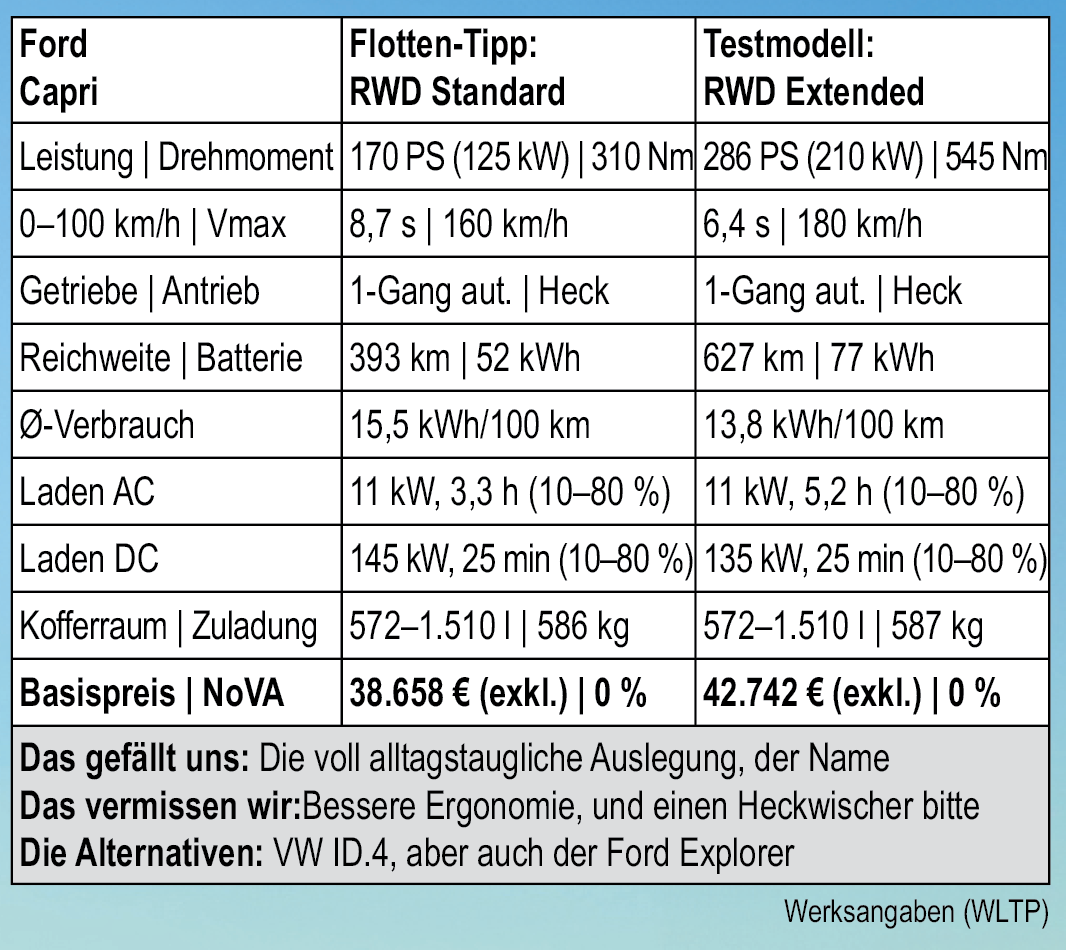 Dass die technische Basis dem Wolfsburger Elektrobaukasten entspringt, ist kein Geheimnis. Interessant indes, wie Ford die vorhandene Technik interpretiert. Der Capri liegt straffer auf der Straße als ID.3 oder ID.4, versucht redlich, die gut zwei Tonnen Leergewicht dynamisch abzufedern, was außer bei kurzen Stößen auch gut gelingt. Mitgefangen ist man hingegen bei Bedienschwächen, zum Beispiel den Touch-Feldern auf dem Lenkrad oder die hinteren Fensterheber, die keine eigenen Schalter haben. Ärgerlich auch die schlechte Übersicht nach hinten. Beim technisch identischen Explorer gibt es das naturgemäß nicht, und bei vergleichbarer Ausstattung ist sogar eine Ersparnis von 2.000 netto Euro möglich. Ob einem das die knackigere Optik Wert ist, muss jeder für sich entscheiden. Doch andererseits war der Capri vor 50 Jahren auch schon teurer als ein praktischerer Taunus.